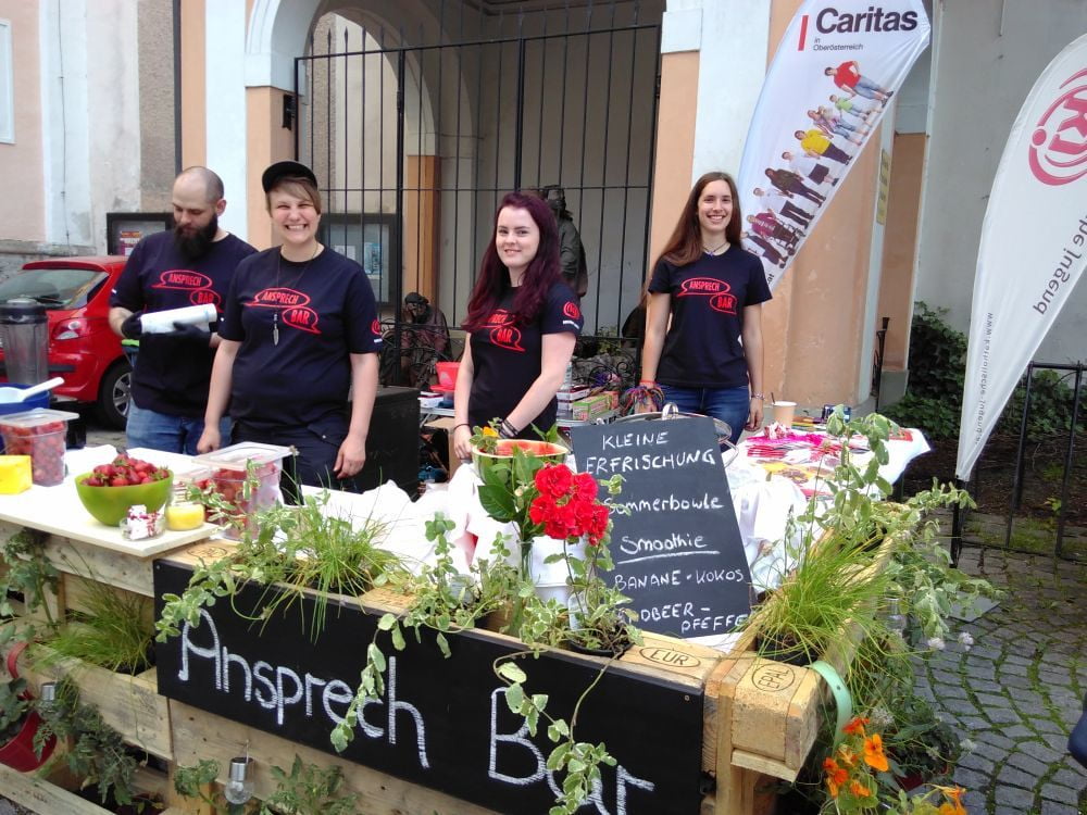 V. l.: SI Gerold Lehner, Michaela Haunold (Caritas OÖ), Angelika Stummer (Projektleiterin), Daniel Neuböck (BG/BRG/BORG Schärding), Ondachlosenseelsorger Helmut Eder, Tim Strasser, Tanja Mittermair und Sandra Hötzeneder